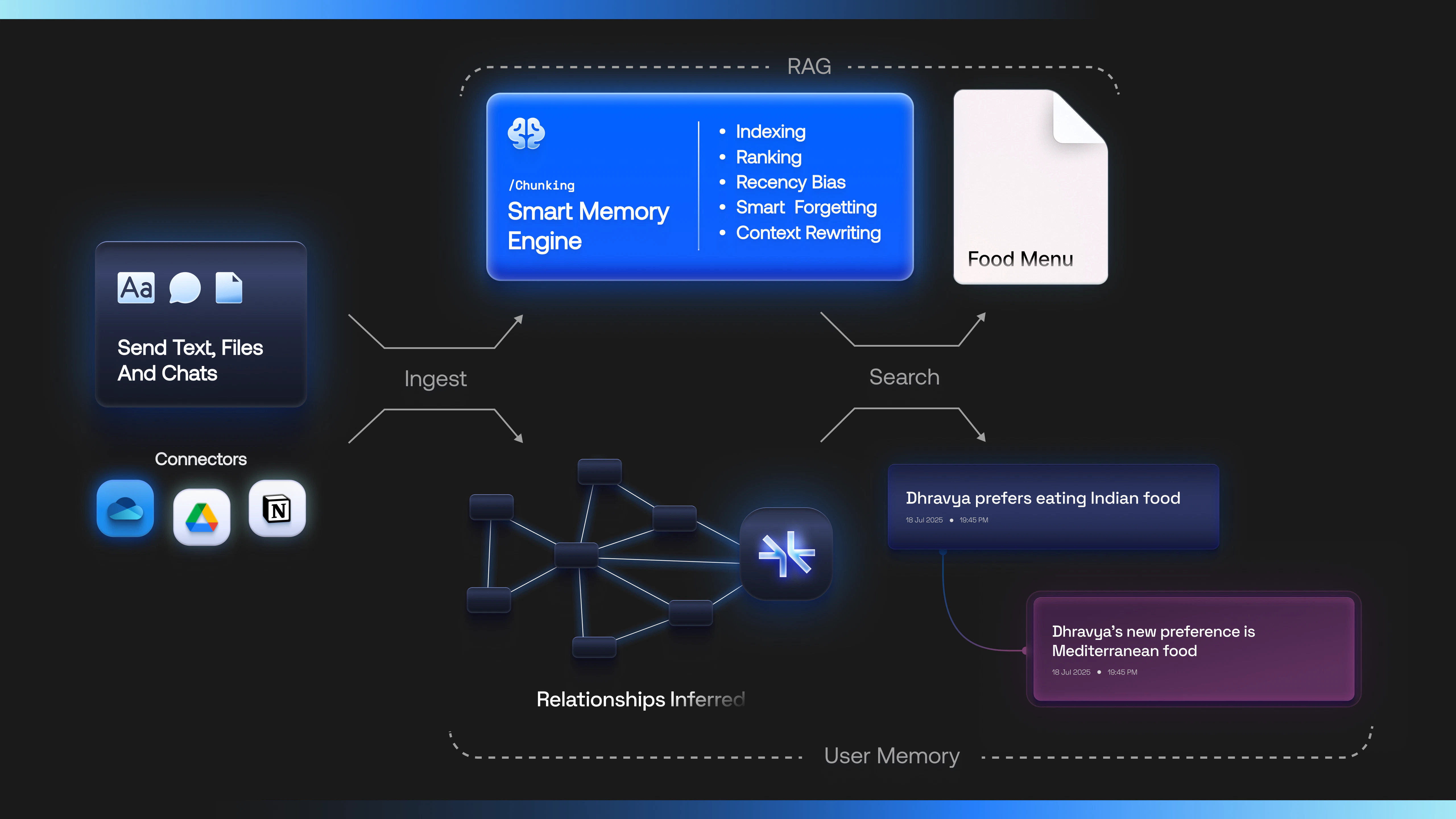 Along with the user context, developers can also choose to do a search on the raw context. We provide full RAG-as-a-service, along with- Full advanced metadata filtering